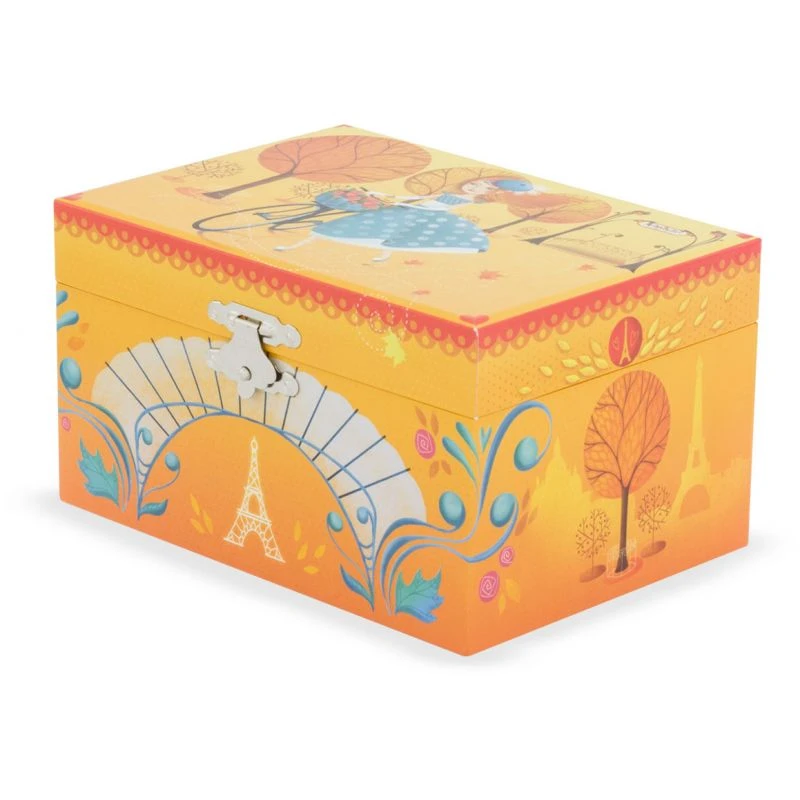 Sur le thème de Paris en automne, cette belle boîte à bijoux musicale accompagnera votre petite fille sur l’air de « A bicyclette » d’Etienne Lorin. Lors de l’ouverture de la boîte à bijoux, la petite danseuse se mettra à danser au son de la mélodie. Le mécanisme manuelle (ne nécessitant donc pas de piles) se trouve au dos de la boîte.