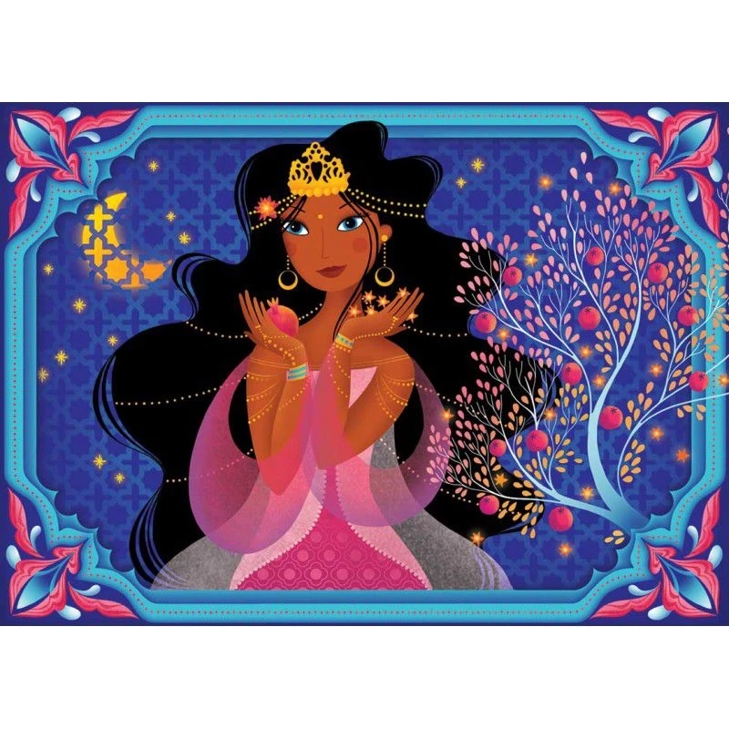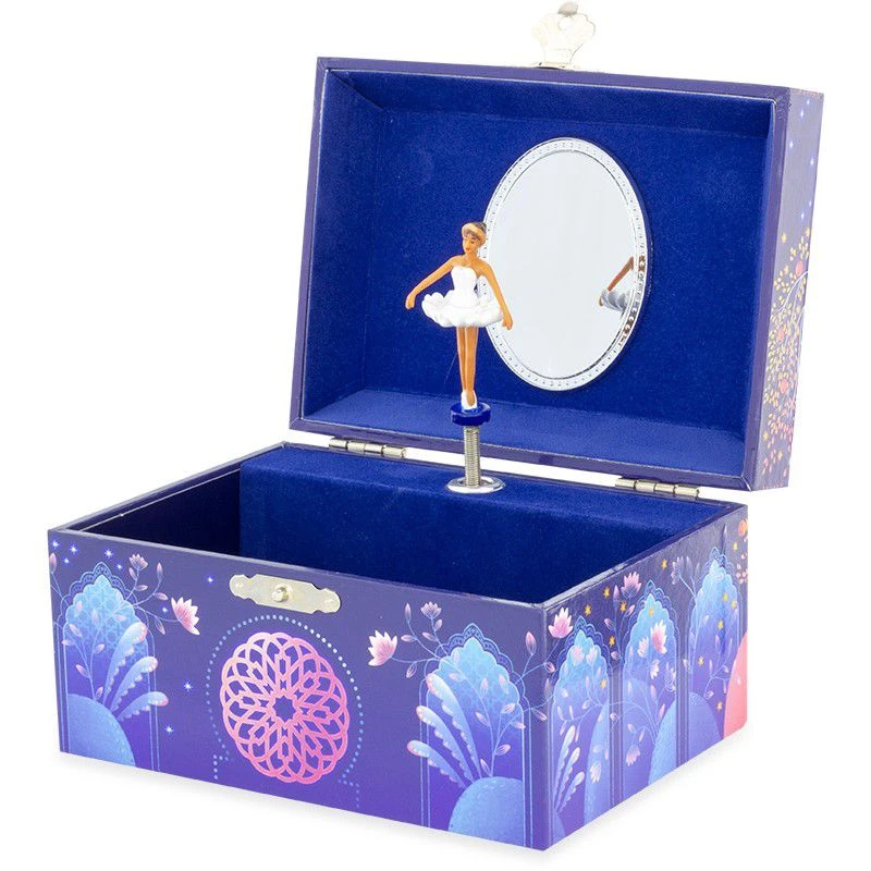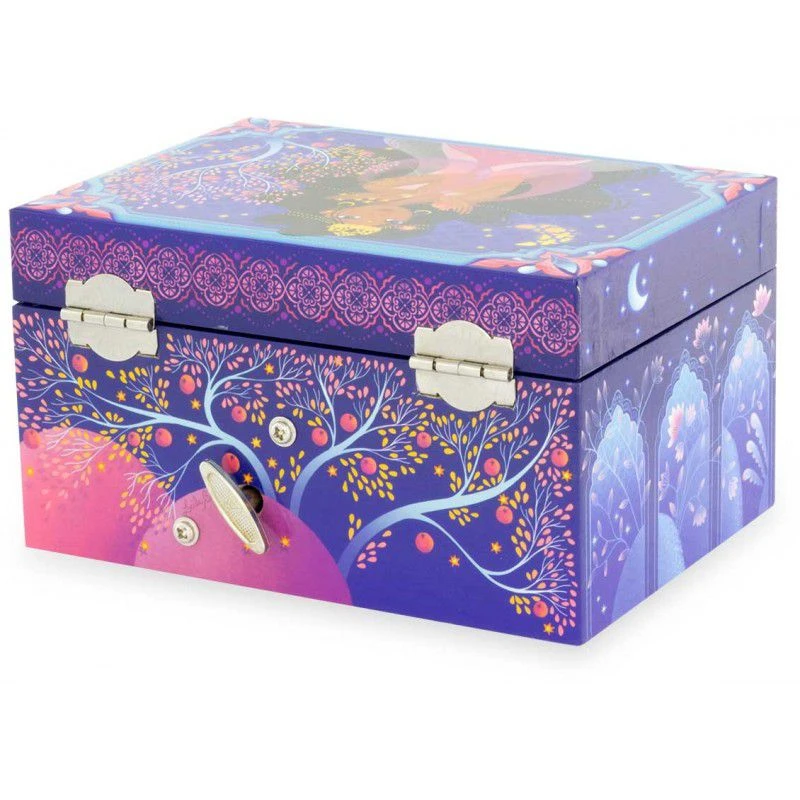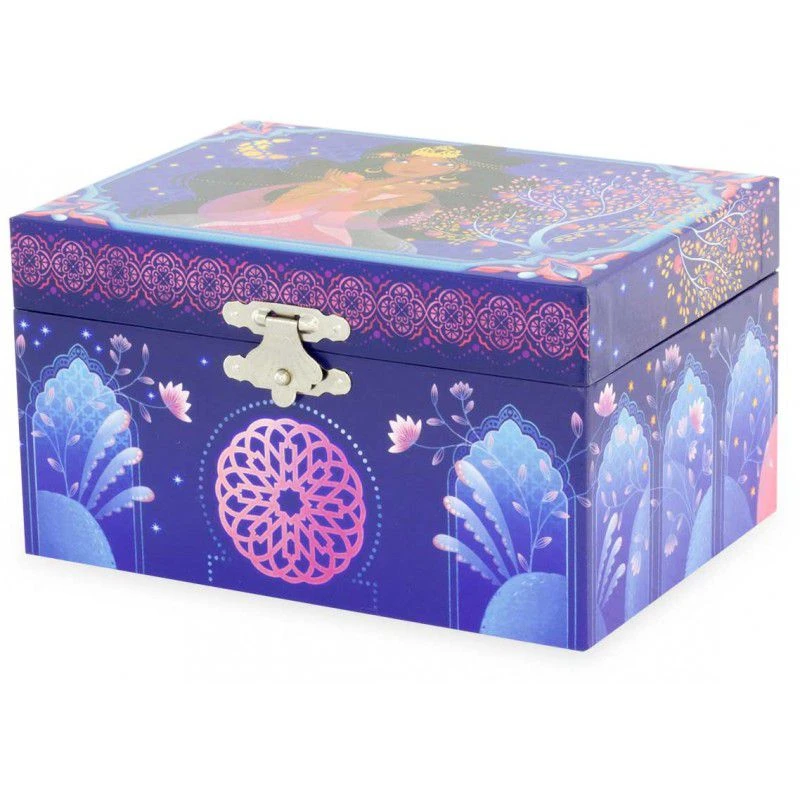 La boîte à bijoux musicale Princesse orientale de la marque Ulysse est une boîte à musique de couleur bleue nuit délicatement décorée de fleurs et de dessins géométriques rappelant les palais des contes de mille et une nuits. A l’intérieur du coffret sur un fond de velours bleu et devant un miroir, une belle princesse en robe blanche se mettra à danser à l’ouverture de la boîte à bijoux musicale sur un air de mélodie.