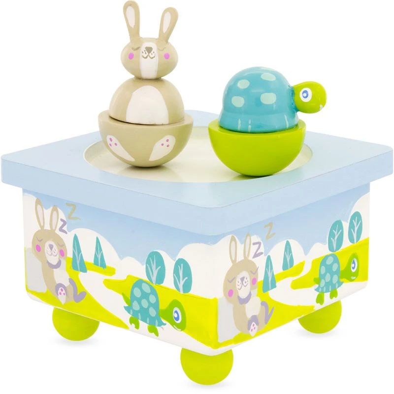 La boîte à musique le lapin et la tortue est fortement inspirée de la fable de Jean de La fontaine Le lièvre et le tortue avec un lapin somnolent et une tortue qui trace tranquillement son chemin. Mais difficile de dire qui gagnera la course lorsque vous remonterez le mécanisme de cette boîte.