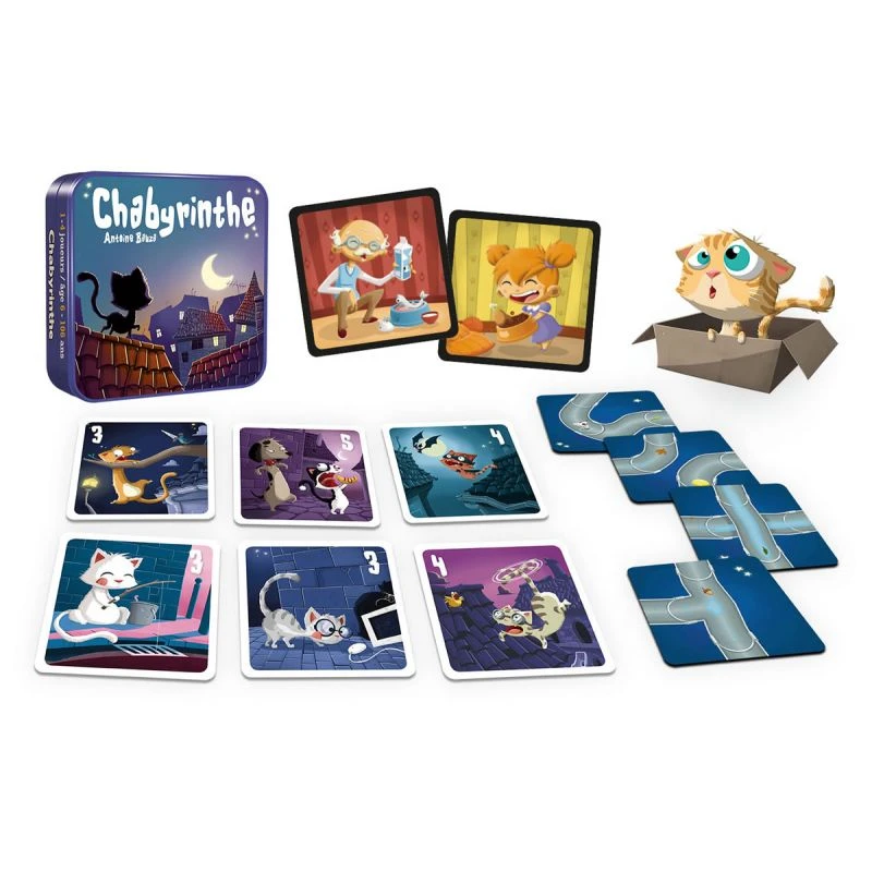 Chabyrinthe est un petit jeu qui ne manque pas de ressources. Il est jouable aussi bien en solitaire, qu’à 2, 3 ou 4 joueurs via ses 5 modes de jeu : la version classique, la version chatons pour les plus petits, solitaire pour jouer en solo, coopératif pour jouer tous ensemble et par équipe pour jouer 2 contre 2!