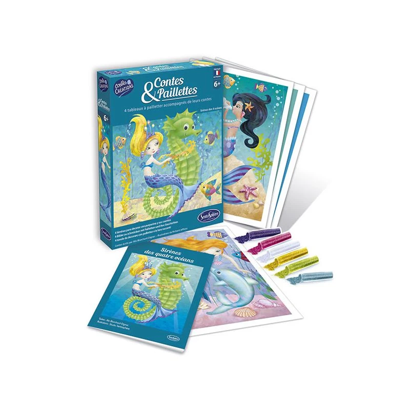 Dans cette nouvelle gamme Contes et Paillettes, Sentosphère a eu la bonne idée d’associer des tableaux à pailleter et un livre de contes qui raconte les histoires des héroïnes. Dans ce coffret Sirènes, l’enfant retrouvera 4 tableaux illustrés représentant de jolies sirènes et 4 contes relatant les histoires de ces sirènes protectrices des océans.