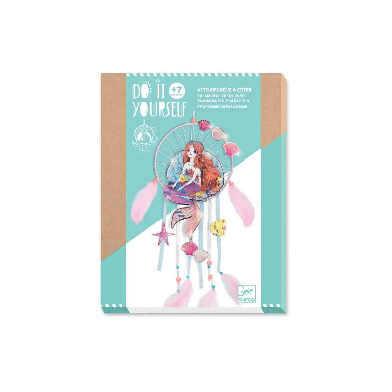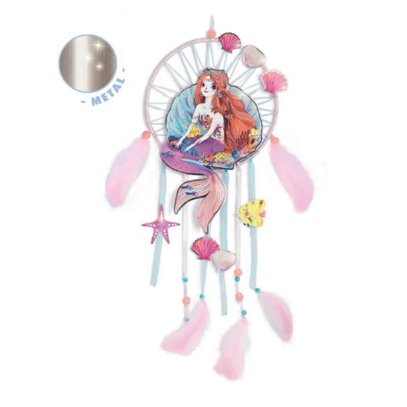 Douce sirène est un loisir créatif Djeco de la collection Do It Yourself vous proposant de créer un attrape rêves. Pour cela les jeunes filles devront assembler l’anneau enrubanné, les perles, les plumes et les différents éléments de décoration avec des effets métalliques à l’aide des différents fils colorés et de l’aiguille. Un livret guidera pas à pas l’enfant dans sa réalisation.