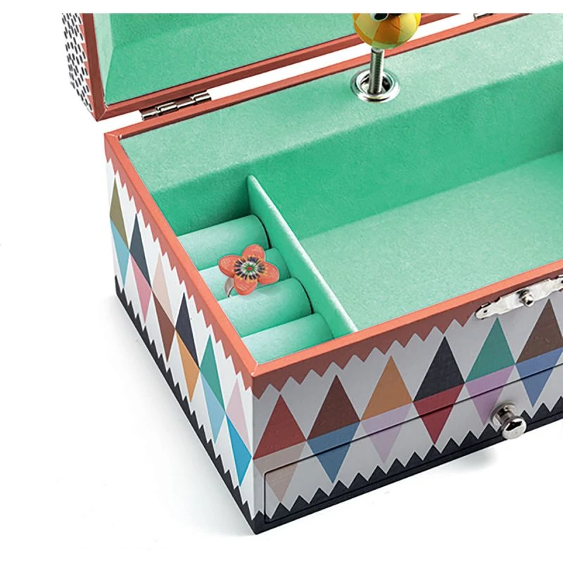 La chanson du panda est une boîte à bijoux musicale originale de part son graphisme avec ses losanges colorés. Elle rappelle la célèbre cabane multicolore Djeco avec laquelle elle pourra être associée pour une décoration assortie de chambre. Cette grande boîte à musique comporte un tiroir pour ranger les petits secrets et un compartiment pour ranger les bagues.