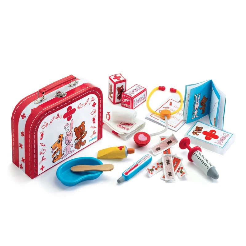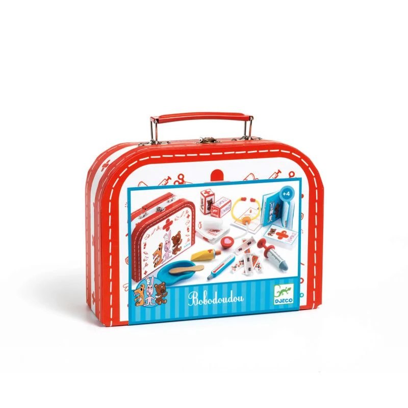 Djeco vous présente la mallette pour jouer au docteur Bobodoudou. Très complète cette mallette de docteur comprenant un thermomètre, un stéthoscope, des pansements, un tube de pommade, une seringue, de quoi rédiger des ordonnances, … Plus de souci pour bien soigner doudou ou le petit frère qui fera office de malade.