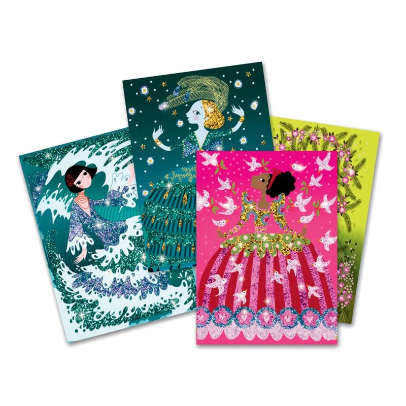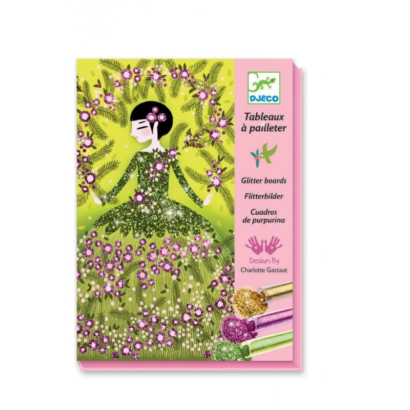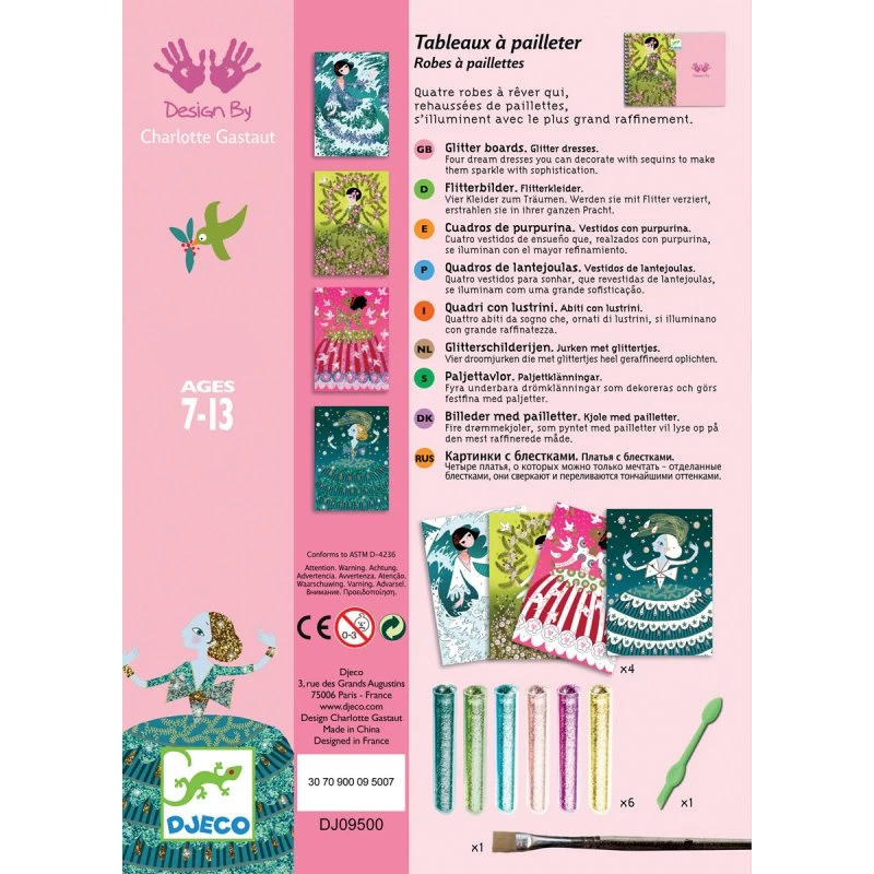 Avec le coffret de loisir créatif robes à pailleter Djeco, votre enfant pourra réaliser 4 splendides tableaux poétiques. Ce coffret contient tout le nécessaire pour la réalisation : les 6 tubes de paillettes, les 4 tableaux féeriques, un outil pour enlever les parties encollées à recouvrir de paillettes, un pinceau pour retirer le surplus et le livret explicatif pas à pas.