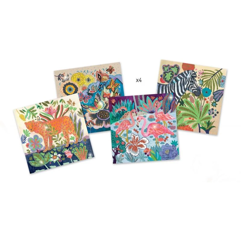 Avec le coffret de tableaux à pailleter Tropico, Djeco vous invite à créer une jungle luxuriante ! Les 4 tableaux brilleront de mille feux avec les paillettes multicolores et brillantes que vous devrez déposer tour à tour en suivant le guide pas à pas.
