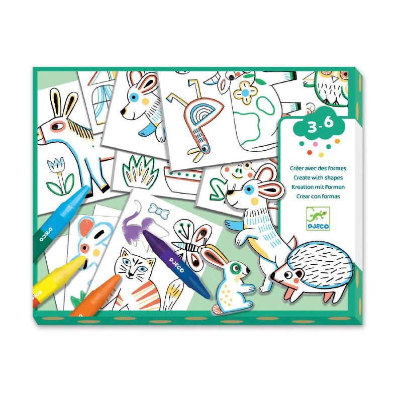 Un monde à créer est une nouvelle collection de loisirs créatifs Djeco comprenant des coffrets thématiques avec des pochoirs, des formes à colorier et à coller sur des feuilles A3. Un monde à créer animaux propose aux enfants dès 3 ans de créer 4 grandes scènes sur la thématique de la nature.
