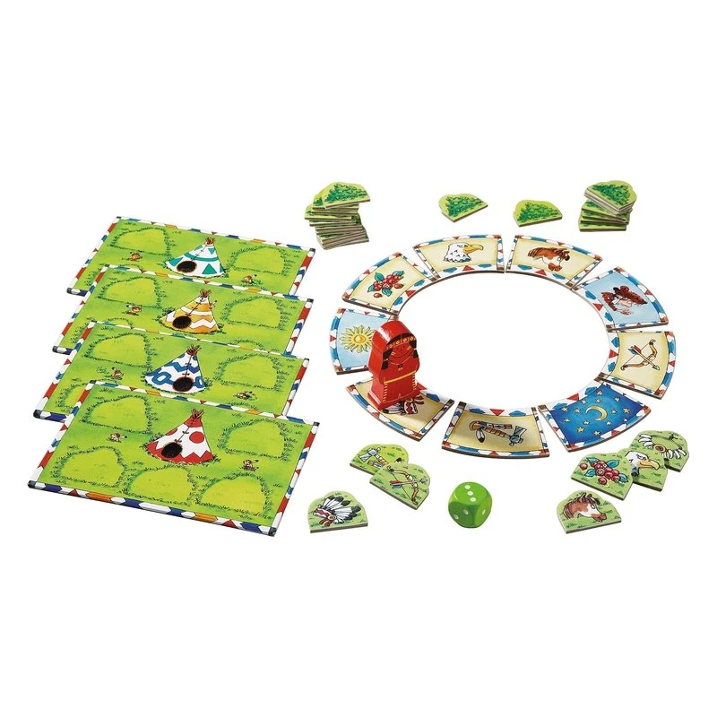Contenu : 1 Indien Dyami (pion), 4 tipis (plateaux de dépôt), 10 cases de sentier d’Indien (7 cases de tâches, 3 cases spéciales), 28 plaquettes-buissons, 1 dé, 1 règle du jeu.
