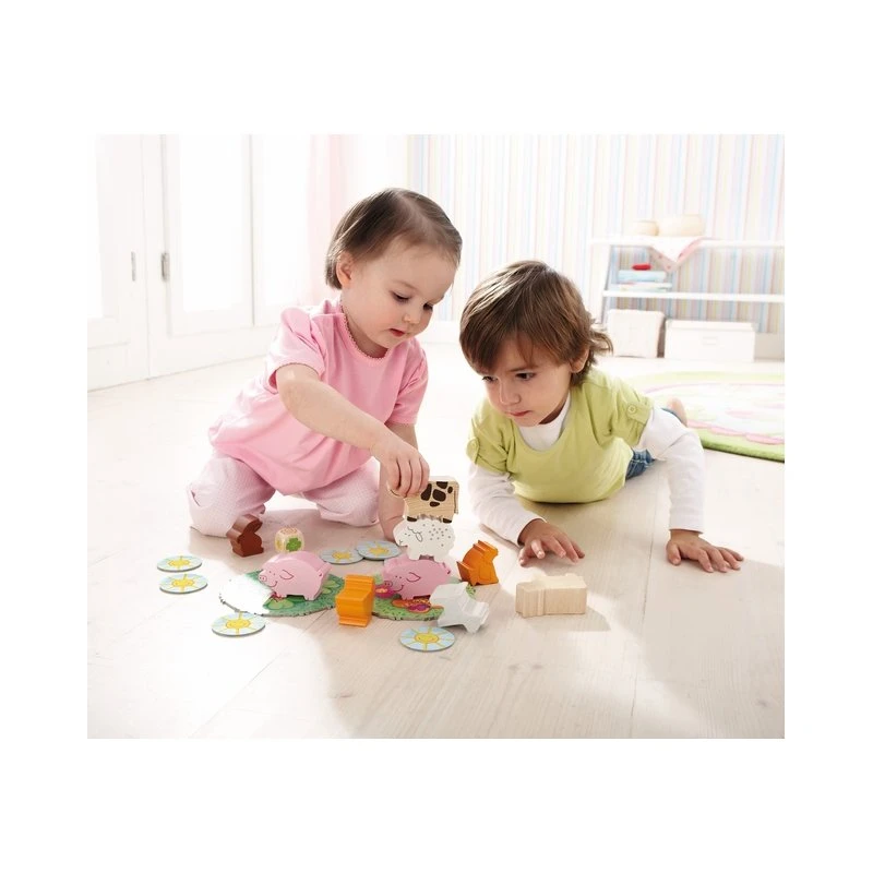 - un jeu d’empilement simple où les enfants vont devoir empiler les 9 animaux dans le pré, les animaux qui tombent ne seront pas remis en jeu