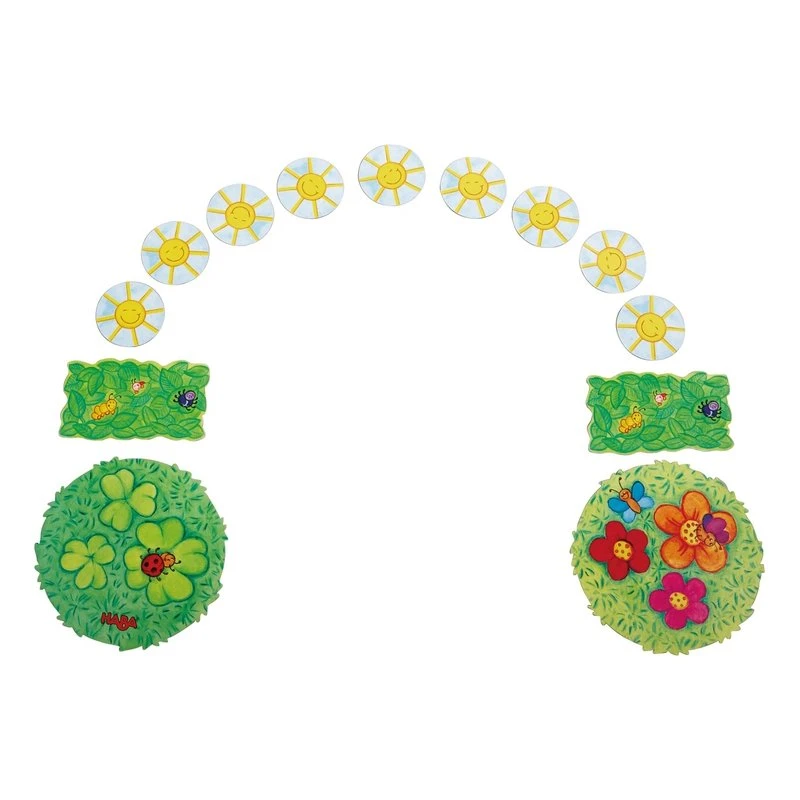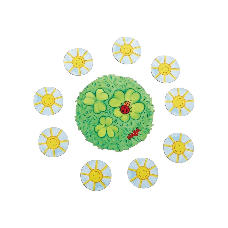 Contenu : 2 vaches, 2 cochons, 2 poules, 1 mouton, 1 chien, 1 lapin, 1 dé à symboles, 1 pré de trèfles, 1 pré de fleurs, 2 buissons, 9 soleils, 1 règle du jeu.