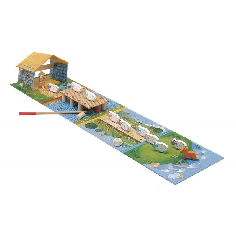 Contenu du jeu : 4 plateaux décorées, 1 bergerie, 1 pont et 10 piliers en bois, 1 baguette pour faire tomber les piliers, 1 bergère, 9 moutons, 1 chien, 1 dé.