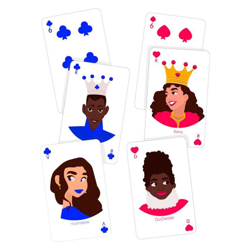 Notez que les cartes conservent par rapport au jeu classique la lettre les identifiant. Ainsi le Roi « R » est remplacé par des Rois et des Reines, les Dames « D » sont remplacées par des Ducs et des Duchesses et les valets « V » sont remplacés par des Vicomtes et Vicomtesses. On s’y retrouve ainsi très vite et ce jeu de 52 cartes peut être utilisé pour tous les jeux de cartes comme la belote