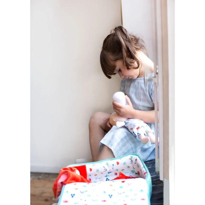 Alex est un poupon en tissu à emmener partout avec soi. Grâce à sa valisette qui lui sert de couffin, bébé pourra facilement emporter la poupée Alex et ses accessoires n’importe où. Il suffira d’ouvrir la valisette et bébé pourra s’amuser à imiter papa et maman avec son propre poupon.