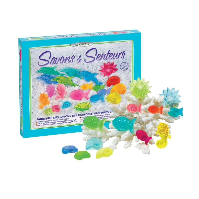 Ce coffret permet de réaliser de ravissants savons de très grande qualité grâce à la base glycérinée transparente proposée. La base fond en quelques secondes au micro-ondes. Dès sa liquéfaction, l’enfant peut doser les différents parfums (pour les senteurs) et colorants (pour la couleur) avant de couler la solution dans un moule. En quelques minutes, le savon refroidit et prend la forme de cœurs, fleurs, coquillages ou poissons qu’il est aisé de démouler.