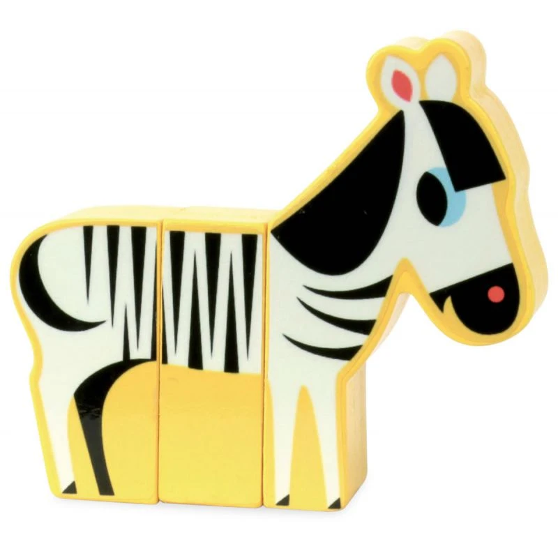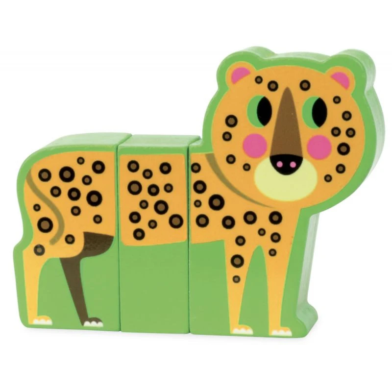 Rigol’animo Savane est un puzzle magnétique composé de 12 grosses pièces en bois aimantées représentant une partie du corps d’un animal : la tête avec les pattes avants, le ventre et les pattes arrières. Avec ces 4 x 3 pièces il est possible de reconstituer un léopard, un lion, une girafe et un zèbre. Les pièces étant compatibles entre elles, il sera aussi possible de « mélanger » les animaux afin de créer de nouveaux animaux rigolo.